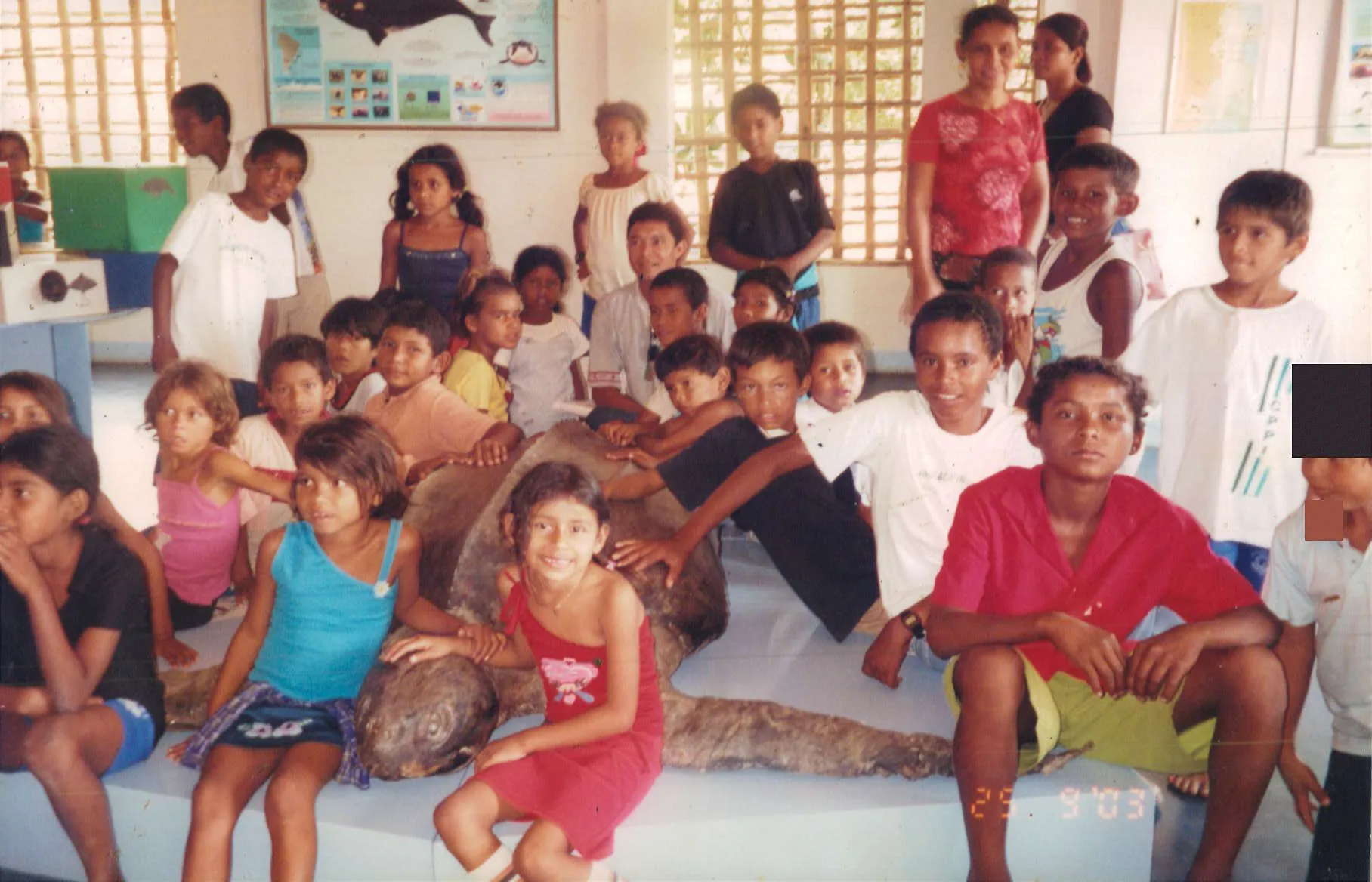 Crianças da comunidade de Regência, visitam o Centro ecológico em Regência. No local, havia algumas espécies de animais empalhados, como por exemplo a tartaruga-gigante.