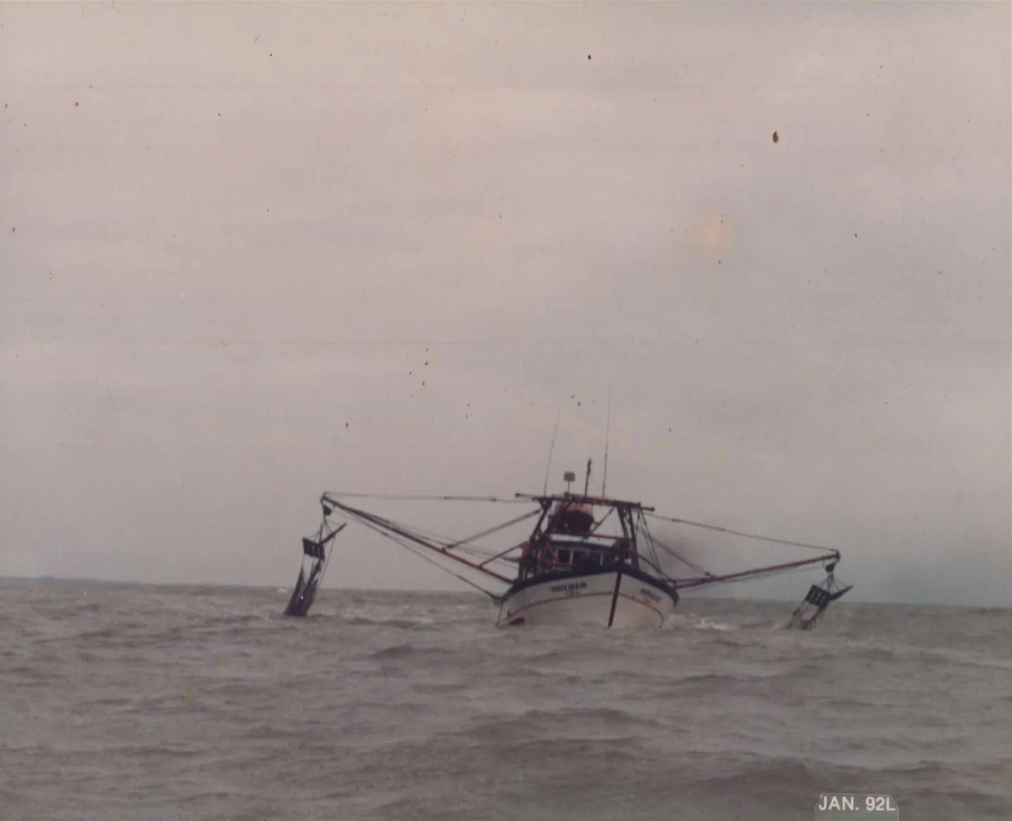 Barco utilizado na pesca de camarão, no mar em Regência.