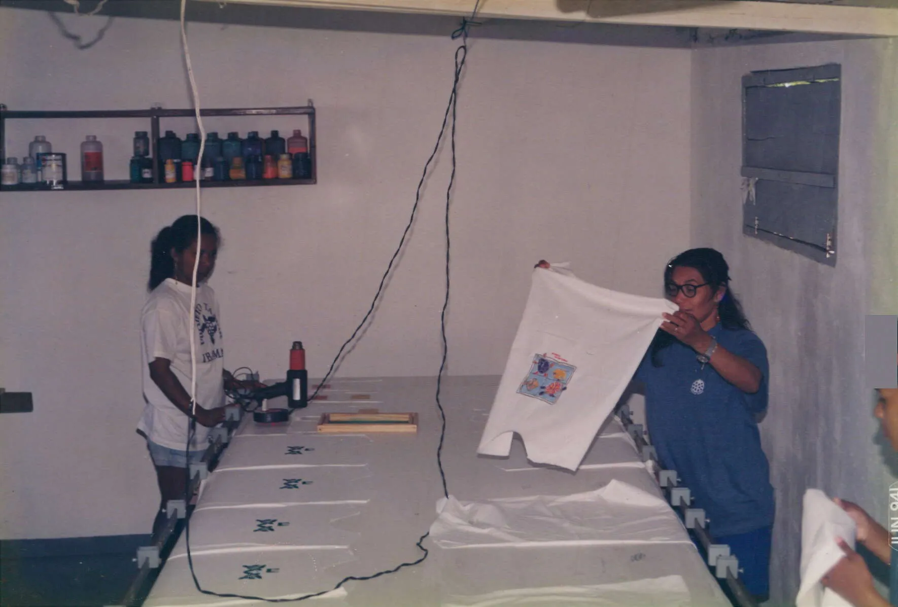Camisetas estampadas em processo de secagem. Trabalho realizado manualmente.