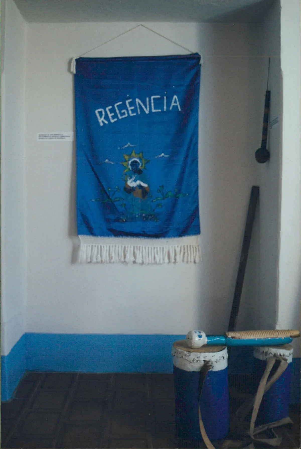 Estandarte com a bandeira e instrumentos da Banda de Congo de Regência