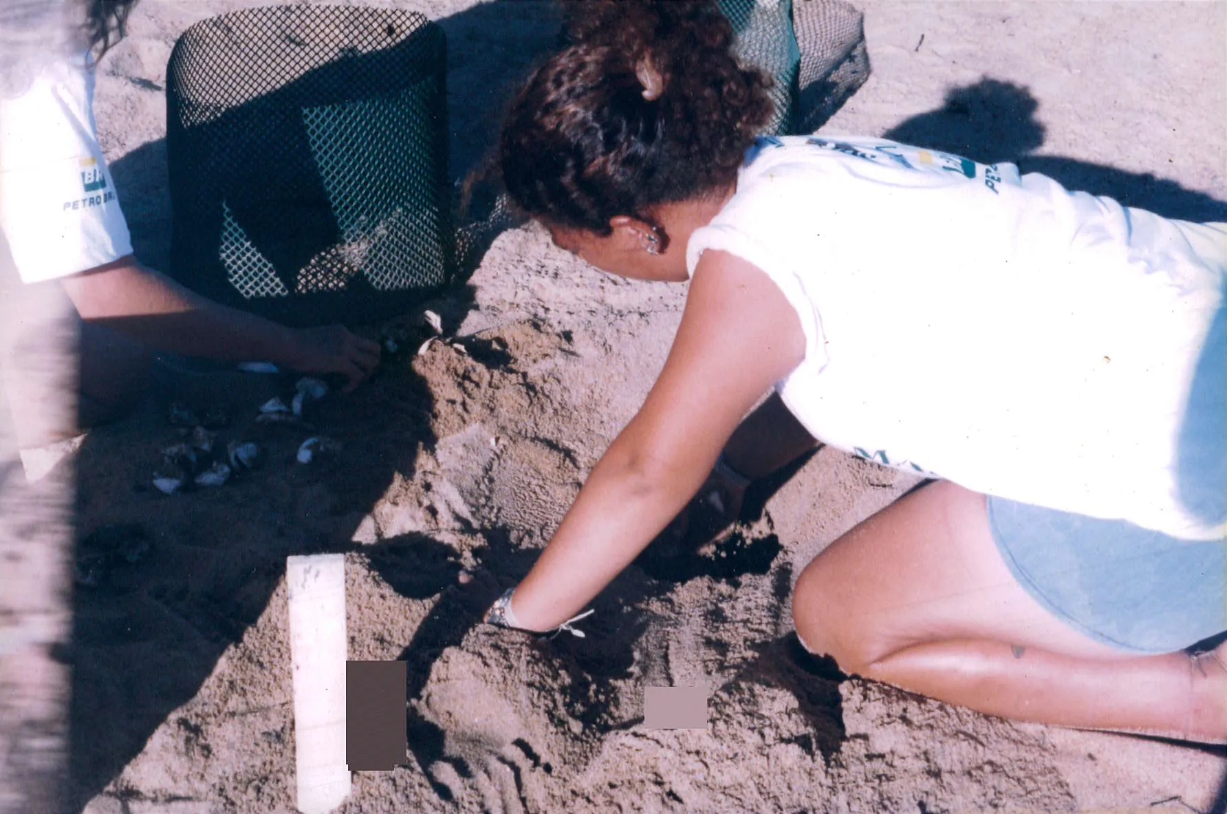 Colaboradores do Projeto Tamar retiram ovos de tartarugas do cercado de incubação.