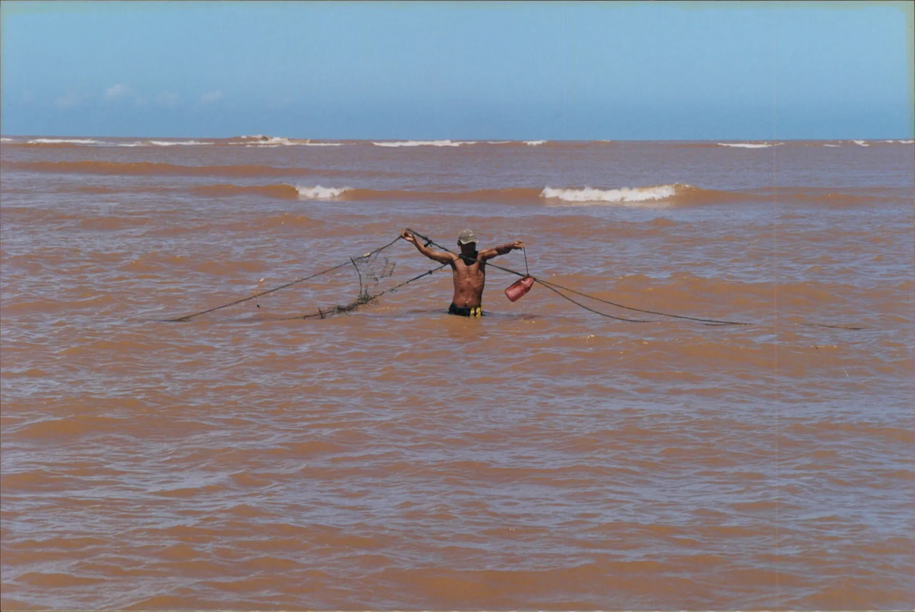 Pescador averiguando sua rede de pesca na foz do Rio Doce.