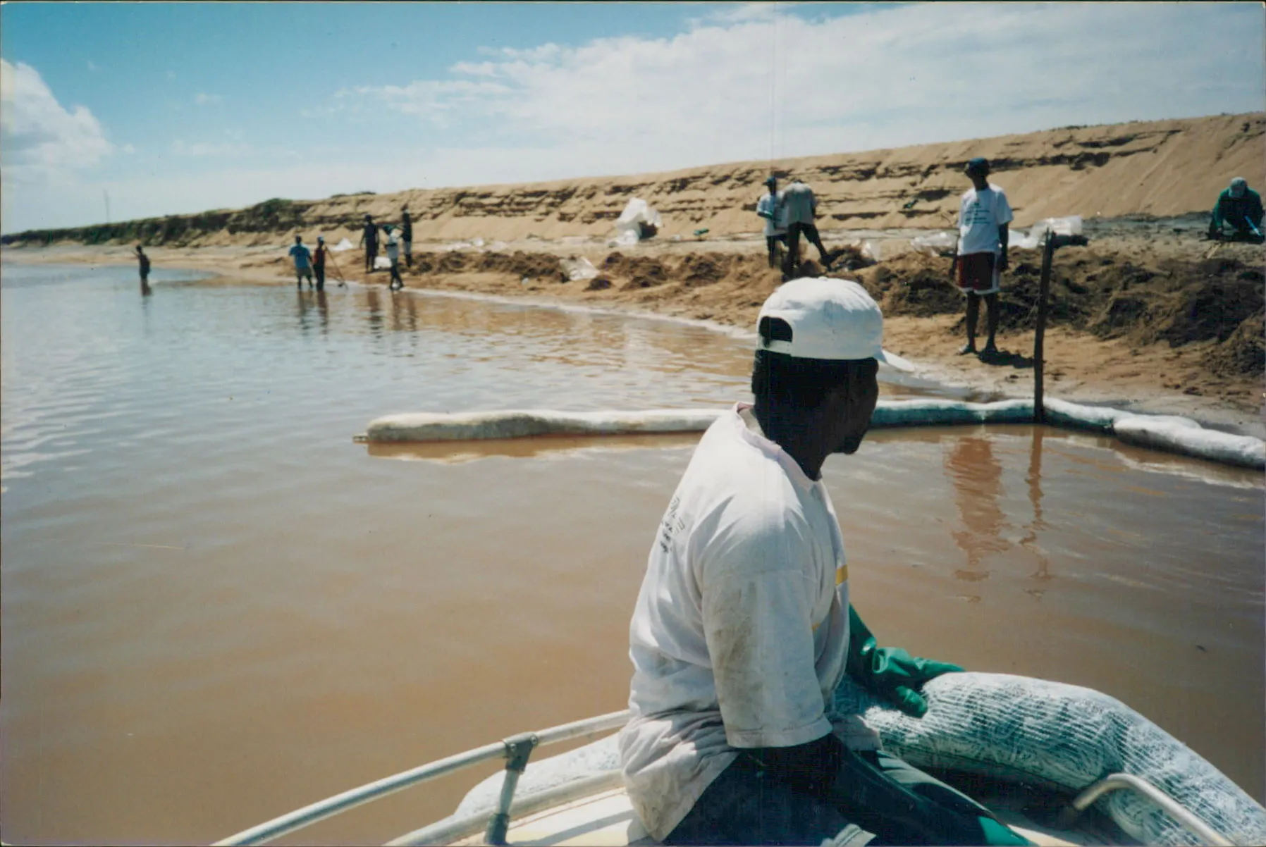 Força tarefa realizada pelos pescadores para tentar conter o óleo derramado no rio Doce.