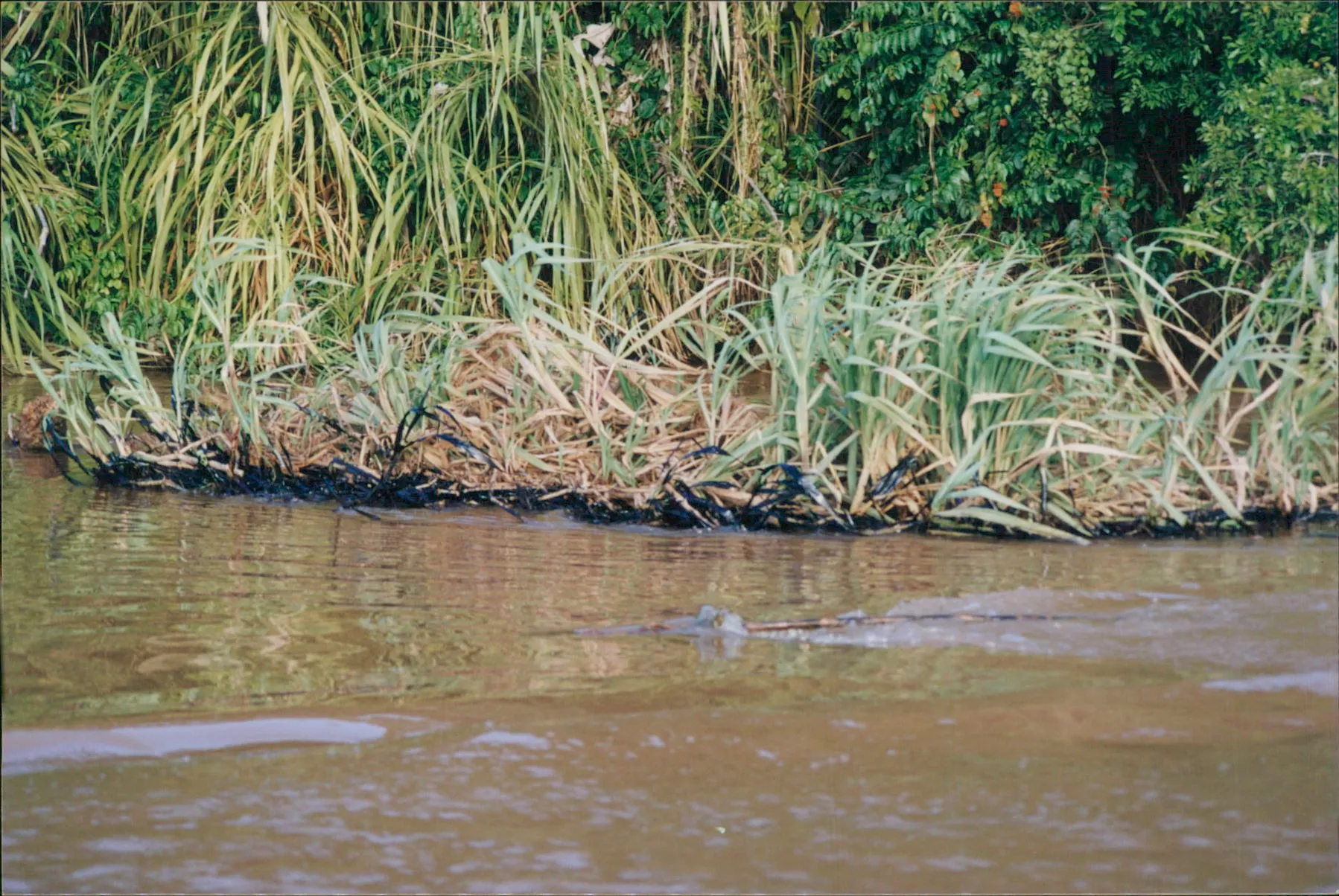 Manchas de petróleo ganham destaque na vegetação costeira do rio Doce.
