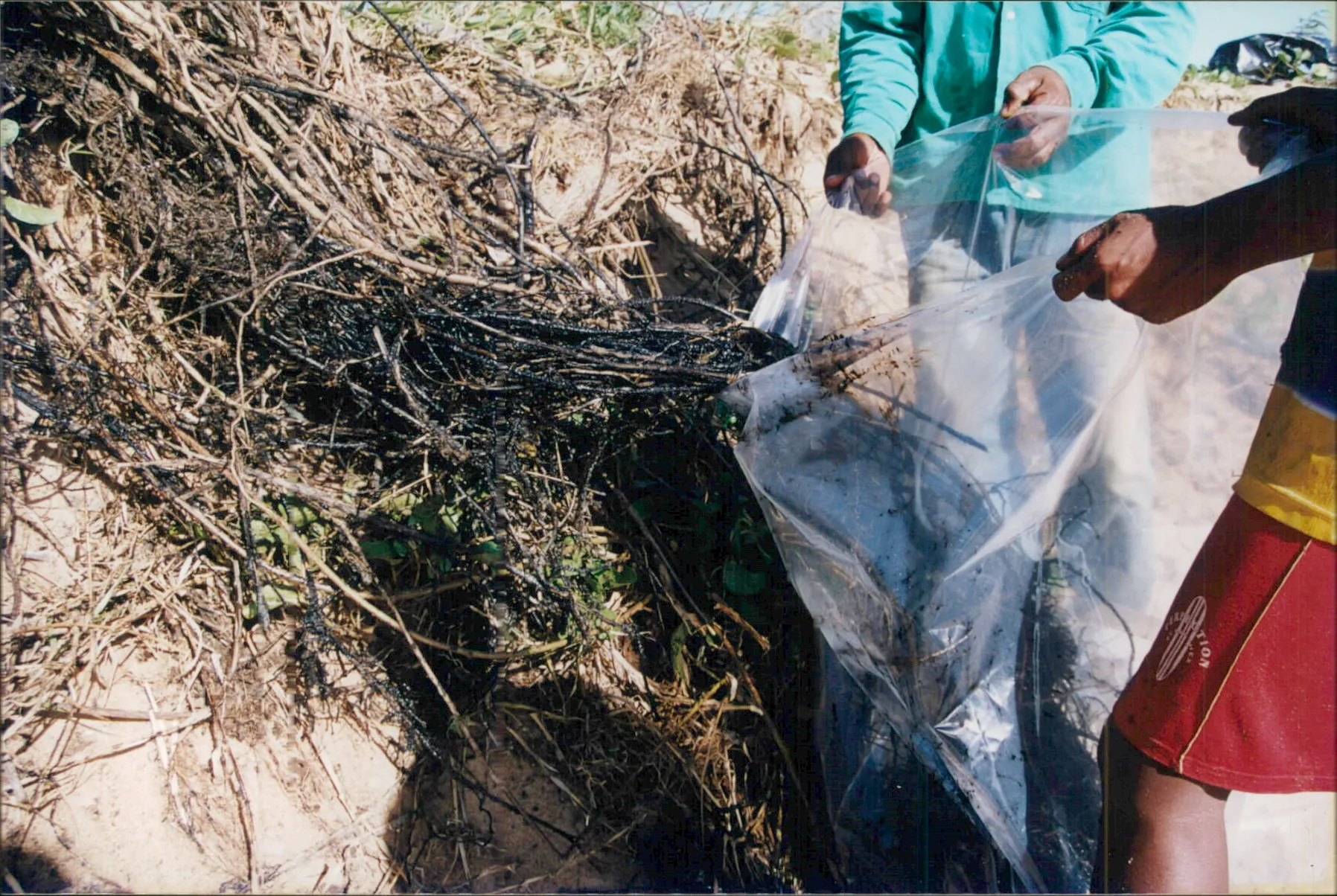 Vestígios de óleo são recolhidos na vegetação na praia de Regência.