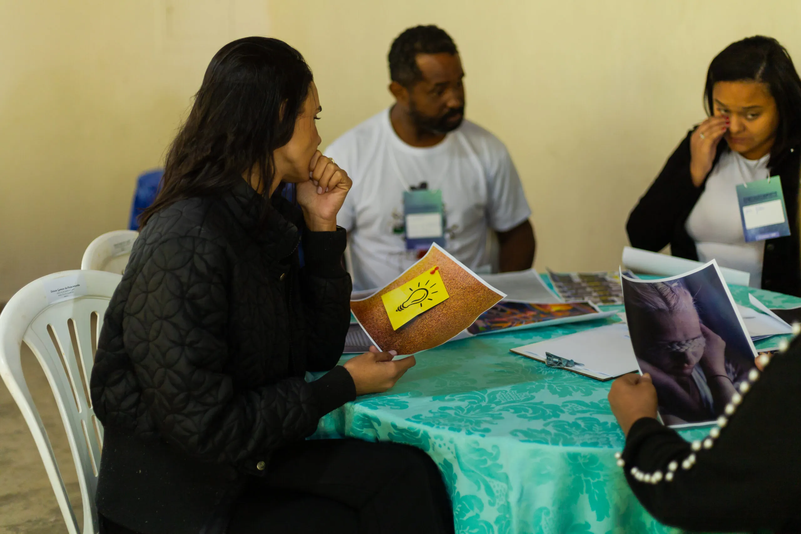 Participante organizando as imagens da dinâmica. Organização visível: Associação Barralonguense das Bordadeiras e Artesãos.