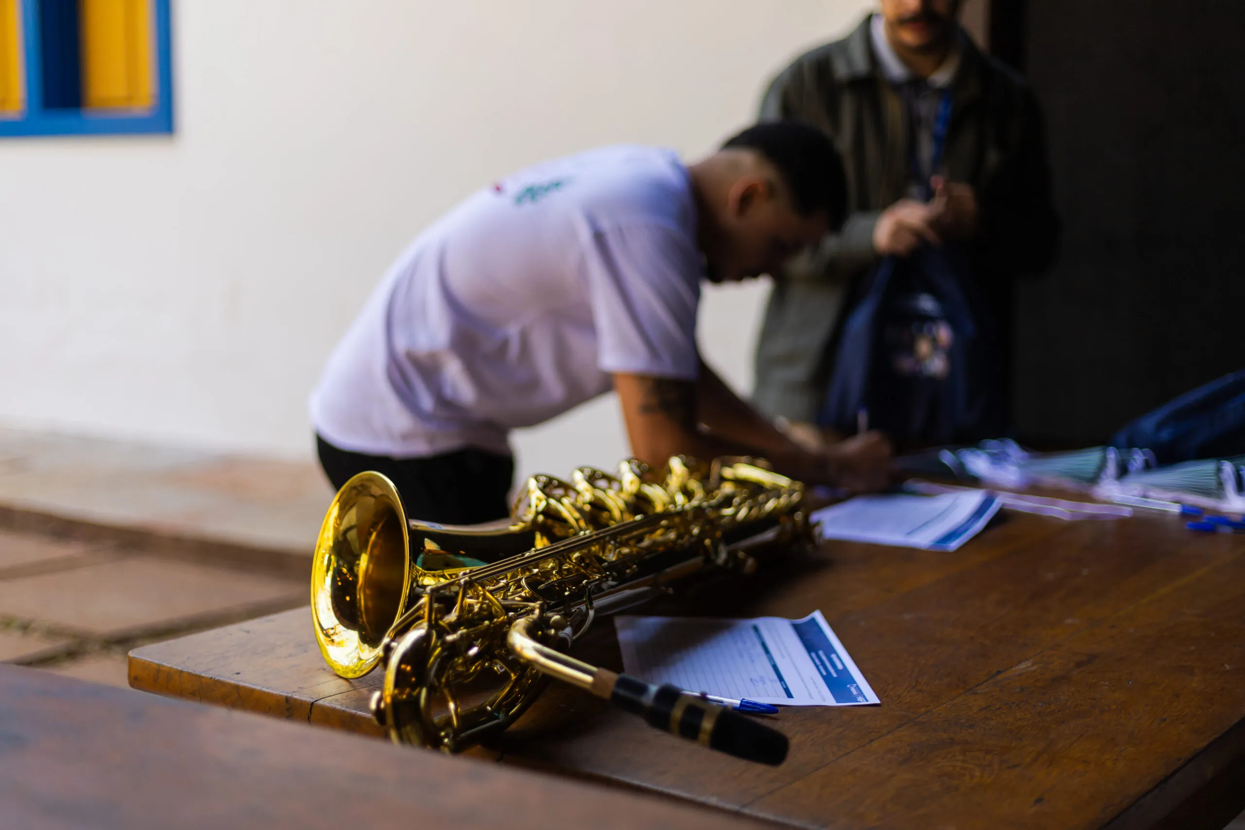 Participante da Corporação Musical Santo Antônio com saxofone na mão, antes de se apresentar.