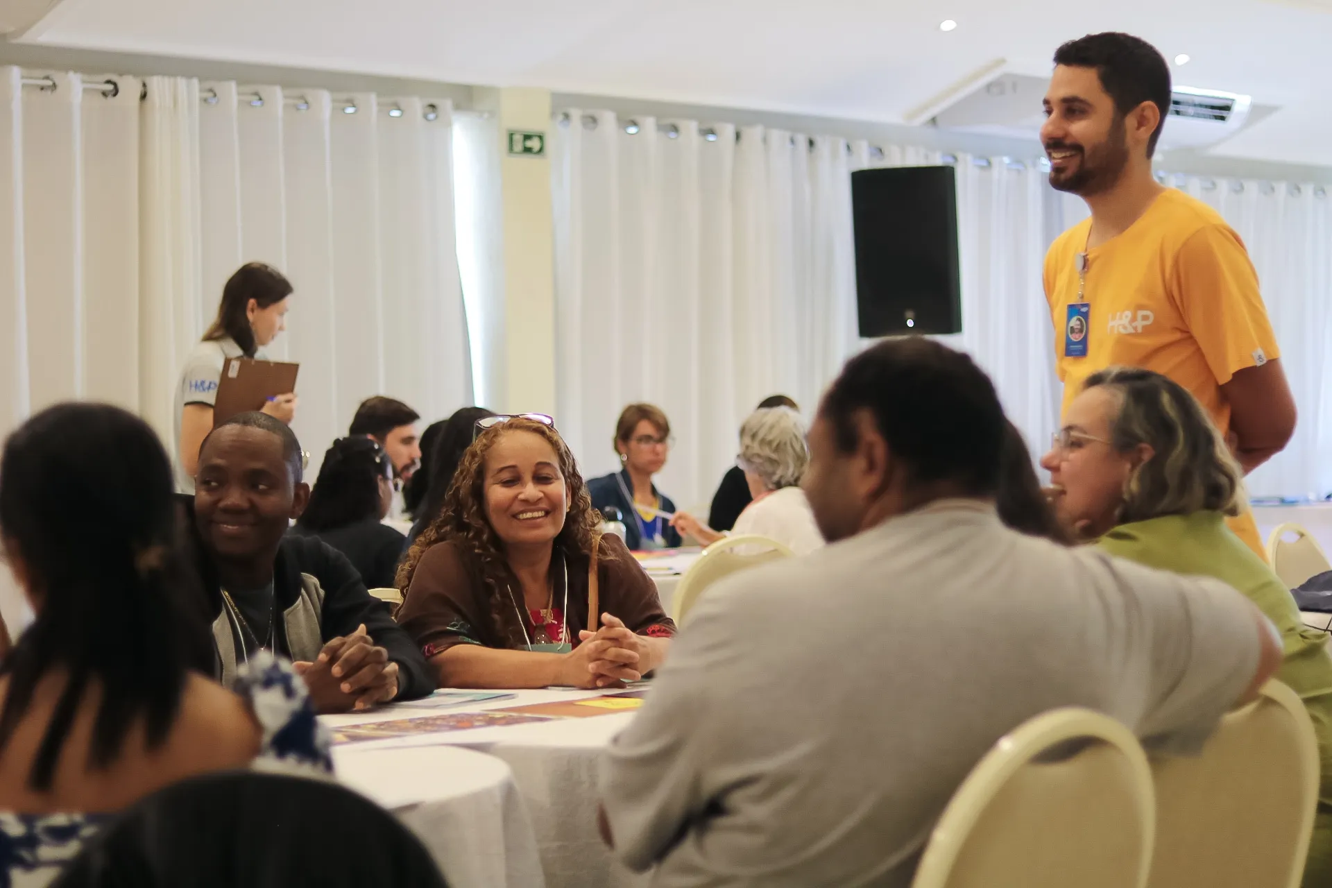 Grupo discutindo sobre as imagens da primeira dinâmica em grupo. Cambuca Ecoturismo.