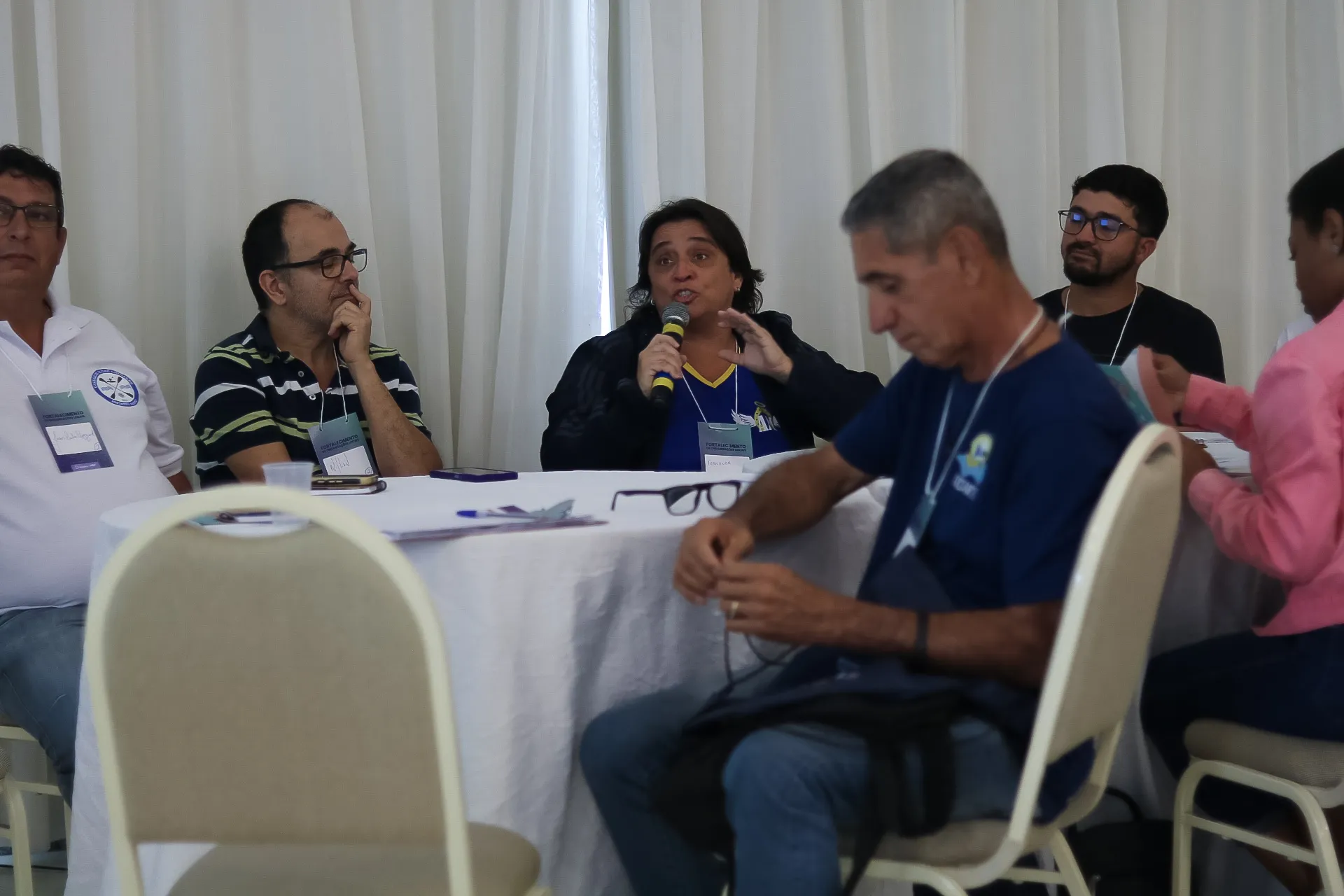 Primeira dinâmica, representante de organização falando ao microfone: Anjos que Montam.
